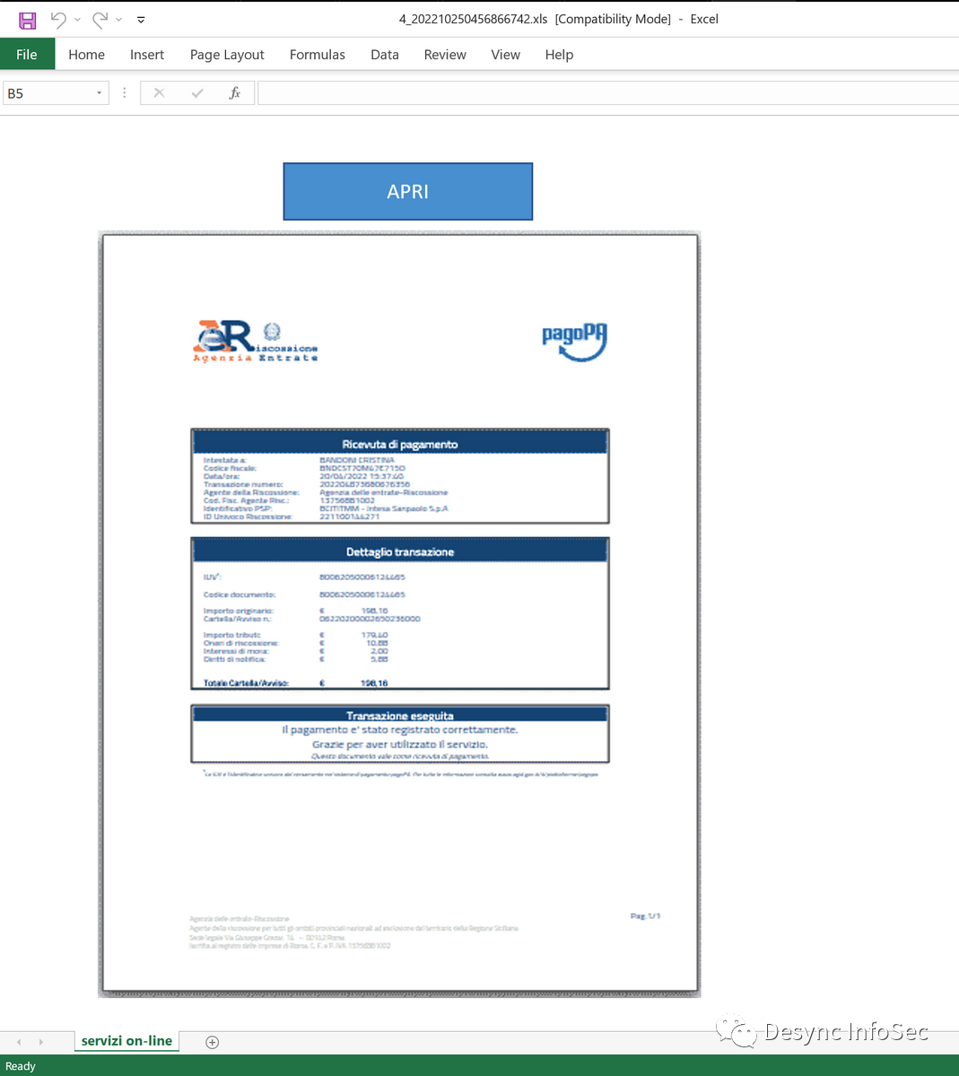 在本例中,我们记录了2022年第四季度发生的一起事件,攻击组织以Excel恶意文档为载荷针对意大利的组织(https://twitter.com/reecdeep/status/1577979717717721088?s=20&t=QWDIpjACeLzPOEy4DDGnUQ)进行攻击,部署IcedID。攻击组织可能希望针对那些未安装Microsoft Office更新补丁(https://learn.microsoft.com/en-us/deployoffice/security/internet-macros-blocked)以阻止从互联网下载的文档运行宏的组织。之前的年终总结中我们提出利用宏进行攻击的方式已经不再流行,但此案例发生在最近的时间,因此对传统的Office宏攻击我们仍然需要保持警惕。