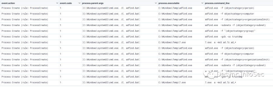 在入侵第六天,我们发现攻击者使用了AdFind和adget.exe,用于查看域内的所有用户、组、计算机、组织单位、子网和信任对象。
