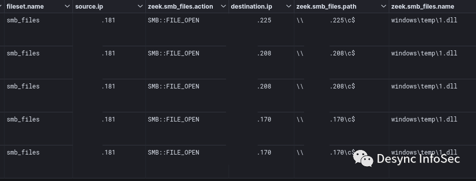 随后攻击者开始探测扫描1433端口来探测网络中的SQL Server数据库,并且同时对网络中的文件共享资源进行探测,浏览文件共享中的密码本文件。攻击者似乎已经将大部分共享文件传出网络,因为我们发现canary诱饵文件告警显示这些文件在企业网络之外被打开。