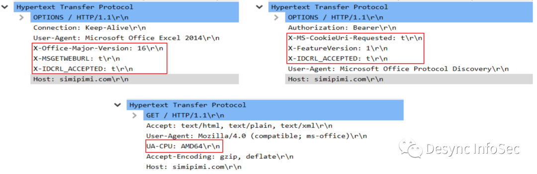 使用特殊的HTTP头,例如X-Office-Major-Version , X-MSGETWEBURL , X-IDCRL_ACCEPTED 和 UA-CPU.