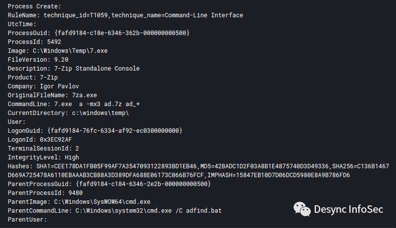 攻击者使用AdFind工具收集域信息,并使用7-zip将数据打包