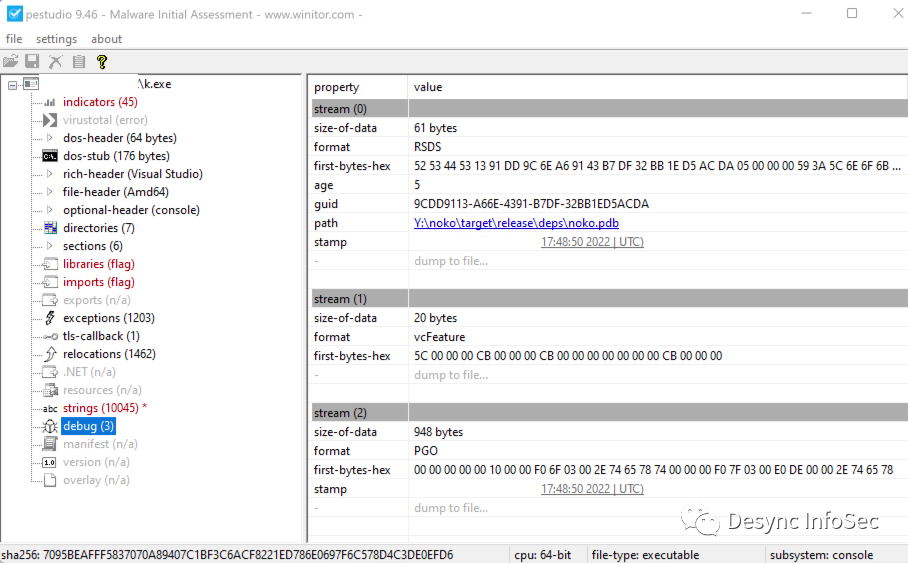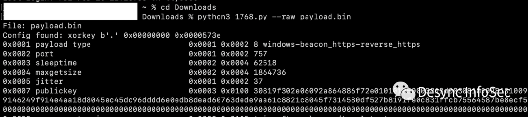 在解码后的数据中我们可以发现MZ头,我们将数据保存,可以使用Didier Stevens(https://twitter.com/didierstevens)的1768.py工具(https://github.com/DidierStevens/DidierStevensSuite/blob/master/1768.py)提取出CS载荷的配置信息
