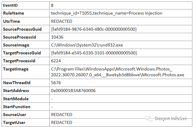 攻击者通过CreateRemoteThread接口向正常进程注入恶意代码,Sysmon的事件ID 8 检测到了这个行为。