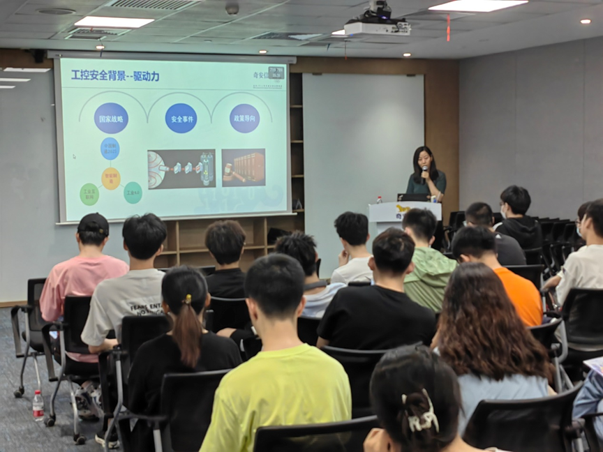 参观完后,同学们来到会议室,聆听了杨萍老师关于工控安全和国内外网络安全的趋势的报告,以及李胜男老师关于校招市场趋势解读及2024奇安信暑期实习项目介绍。同学们针对两位老师的讲解提出了许多问题,也得到了老师们耐心和细致的答复。