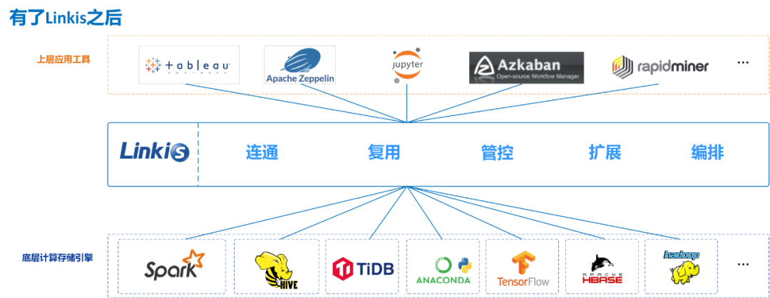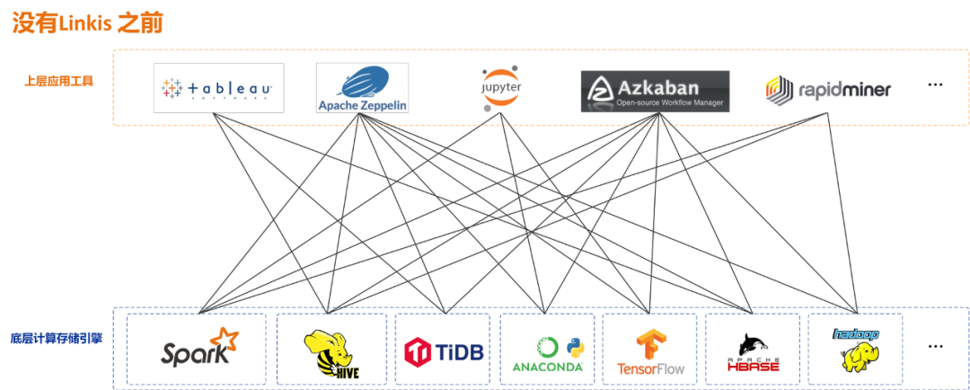 不过为了心中的梦想,风雨中这点痛算什么?就酱,Linkis 总算开源了!邸帅像第一天出摊儿的商贩,看着一个个陌生面孔入群,有一种“只要您发话,我什么姿势都能给”的冲动。。。最开始,大家问的都是小白问题,操作系统版本不同咋办?底层环境报错咋整?哪怕打开“用户文档”随便看一眼就能解决的问题,邸帅他们也像五星级宾馆的侍者一样彬彬有礼地回答,答完再鞠俩躬给人家送走。。。听他们回忆这段儿的时候我突然想,在那个瞬间,Linkis 会不会是全世界最 nice 的开源社区,没有之一?就是这样的“跪式服务”,呵护了 Linkis 最初微弱的星火。渐渐地,火苗震颤着长大。。。一开始,只有技术人员以个人名义研究 Linkis,几个月后,开始有公司测试 Linkis 代码。BOSS 直聘,就是最早把 Linkis 用在生产环境中的公司之一。按理说,招聘这事儿和银行业务没啥关系。但数据分析的底层逻辑都是相通的,所以 Linkis 同样可以被其他行业拿去用,足见老师傅深厚的代码抽象功力。有一天他打开项目页面,突然发现有人提交了一段代码补丁,提交者正是 BOSS 直聘的老师傅。“能写出这段补丁,一看就是人家非常深入地使用了 Linkis!发现个小问题,我都不敢在页面直接回复他,怕打击积极性。。。私聊指出来,人家改完之后我赶紧给合并进去!”强哥回忆。和其他公司的老师傅在同一个代码项目上贡献力量,颇有一种“海内存知己天涯若比邻”的感觉,这让人着迷。那段时间交流比较多,他们还搞了个腾讯会议,大家日常上班干活儿时都挂在会议上,想到了和 Linkis 相关的改进意见,就随时在语音里吼,就跟一个公司的团队一样。就这样,在赛博世界,Linkis 成为了一间小小的“武馆”,各方侠客都在此歇脚切磋,灯烛摇曳诗酒氤氲。“突然发现,大家好像没啥说的了,也没夸奖,也没吐槽。”他回忆。Linkis 最初的研然是为了满足微众银行的需要,自然也就只支持微众银行用到的计算引擎,所以尹强他们把技术架构做成了“连连看”——只要把这些引擎和应用都连通,不就解决问题了嘛!但这导致了一个问题,在这个架构上,再想支持新的引擎,就会变得极其麻烦。Linkis 社区的开发者和用户一看,反正能支持的引擎已经支持很好了,不能支持的以后怕也不会支持了,那还有啥可说的?换句话说,在原来的架构下,Linkis 基本走到头了。他拉着尹强,痛陈利害,请他操刀给 Linkis 做一次脱胎换骨的手术!尹强点灯熬夜,从头到尾看了 N 遍代码,突然“灵魂附体”,顿悟出一种更高维度的“海纳百川”架构,有机会把所有计算引擎都囊括进来。