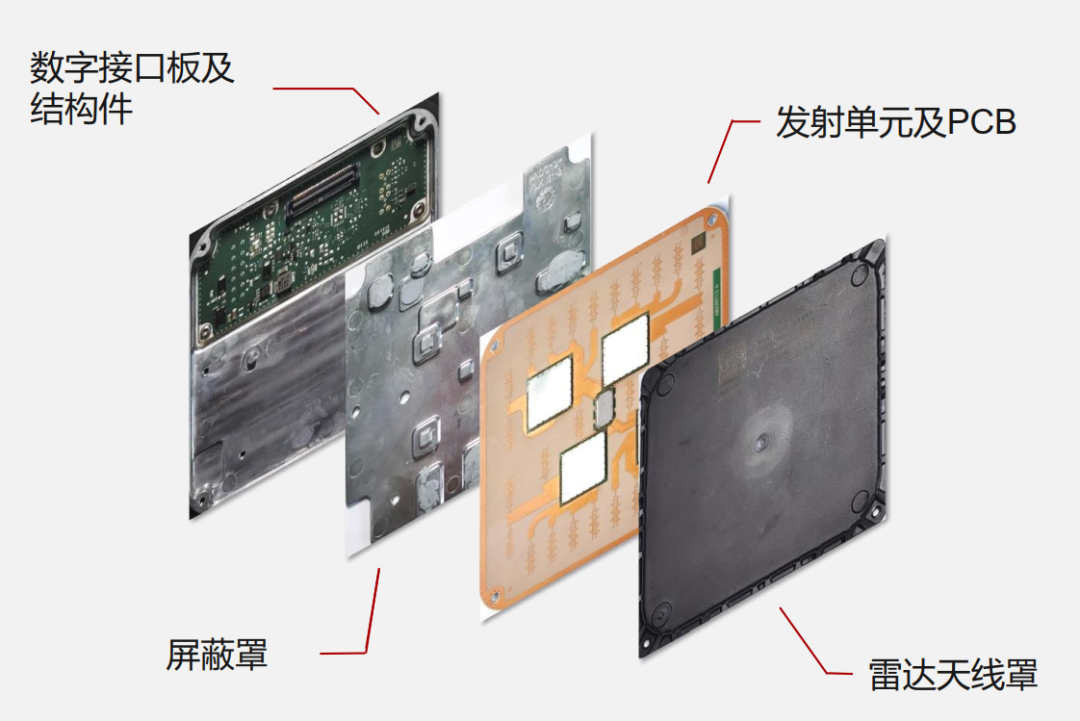 下面来看看采埃孚装在飞凡汽车上的4D的毫米波雷达。从下图可以看出4D毫米波雷达共由四部分组成,分别为数字接口板及结构件、屏蔽罩、发射单元及PCB以及雷达天线罩。![]()