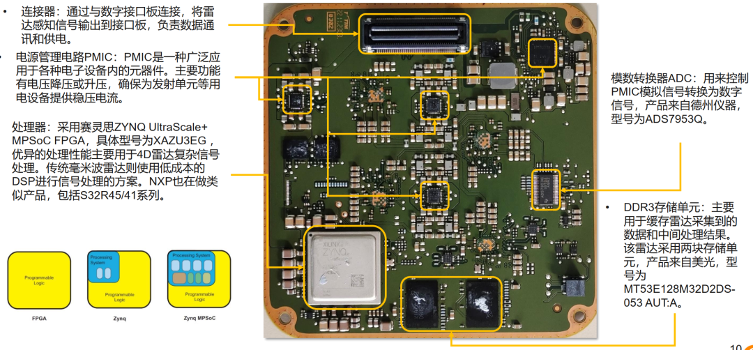 MPSoC FPGA,具体型号为XAZU3EG,模数转换器ADC:用来控制PMIC模拟信号转换为数字信号,产品来自德州仪器,型号为ADS7953Q。DDR3存储单元:主要用于缓存雷达采集到的数据和中间处理结果。该雷达采用两块存储单