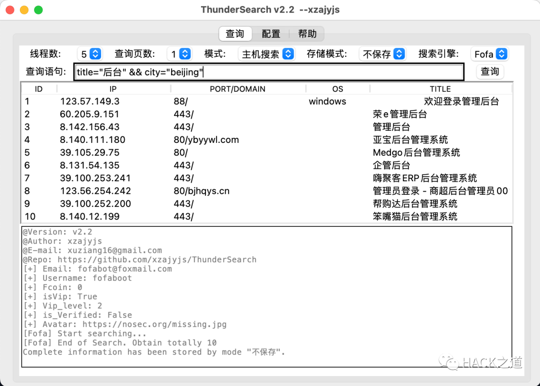 ThunderSearch(闪电搜索器)是一款使用多个(目前支持Fofa、Zoomeye、360Quake,未来将支持Hunter、Shodan等)网络空间搜索引擎官方api开发的GUI界面的信息搜集工具。