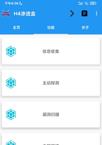 H4渗透盒子是由@H4CKBU7EER开发,基于安卓的渗透测试工具集!使网安爱好者在手机上不必使用拗口的英文软件和看群蚁白字的手机终端的便携工具。