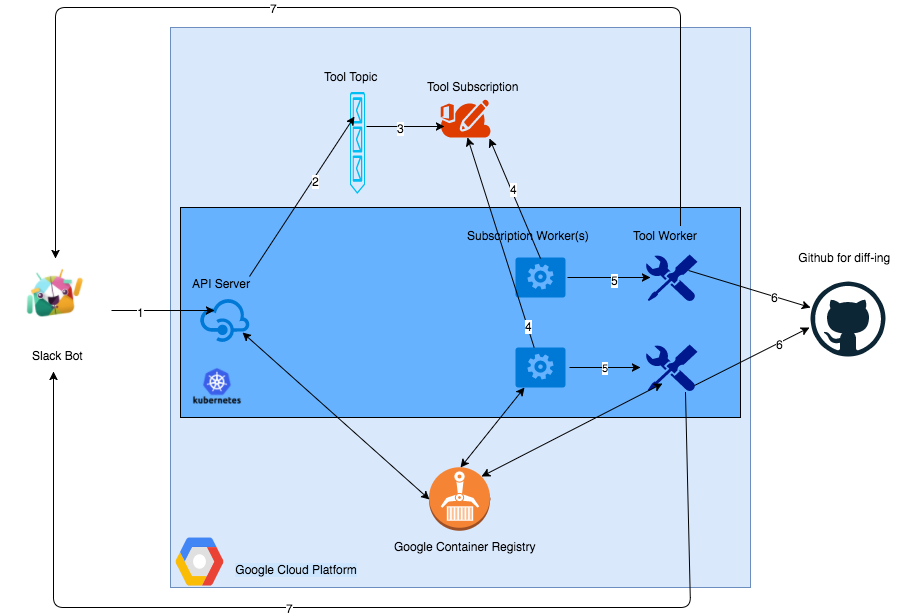 API请求由Slackbot发起,发送至API服务器,API服务器以Kubernetes(K8s)集群中的Docker容器运行,可以根据需求调整规模大小。