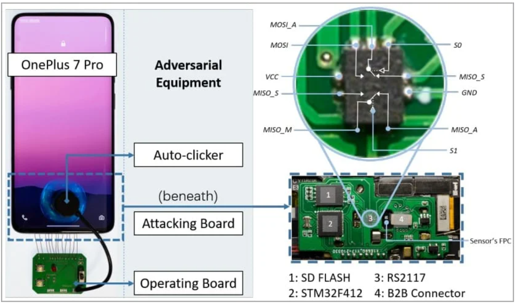 研究人员利用了2个0 day漏洞来绕过智能手机上现有的针对暴力破解的防护措施,比如尝试次数限制和活性检测。这两个漏洞分别是Cancel-After-Match-Fail (CAMF,匹配失败后取消)和Match-After-Lock (MAL,锁定后匹配)。研究人员发现指纹传感器的串行外设接口(Serial Peripheral Interface,SPI)上的生物数据未得到充分的保护,可以通过中间人攻击(MITM)来劫持指纹图像。