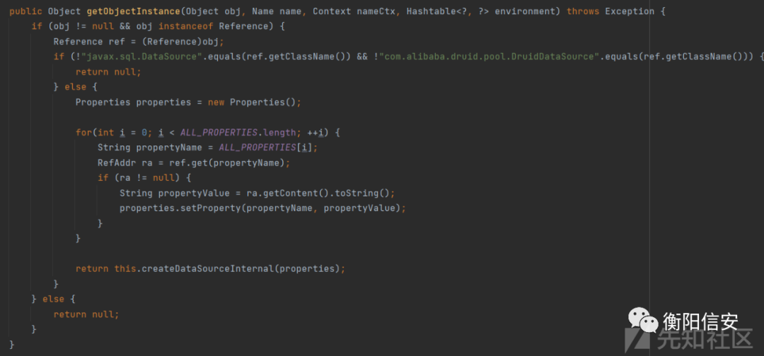 Reference ref = new Reference("javax.sql.DataSource","com.alibaba.druid.pool.DruidDataSourceFactory",null);