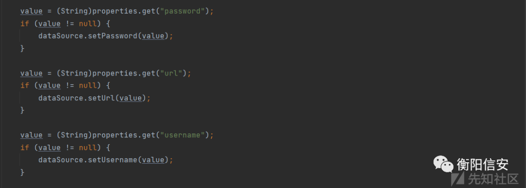 在config函数中,有设置password,url,username的操作,要是能再发起一个连接,那岂不是可以用来当作jdbc攻击的入口。