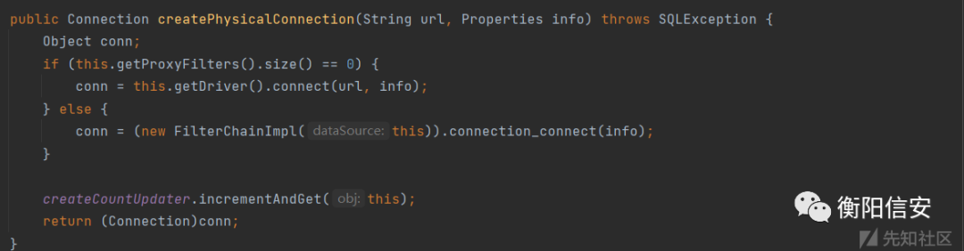 一直跟进,最后在createPhysicalConnection函数中发起了JDBC连接