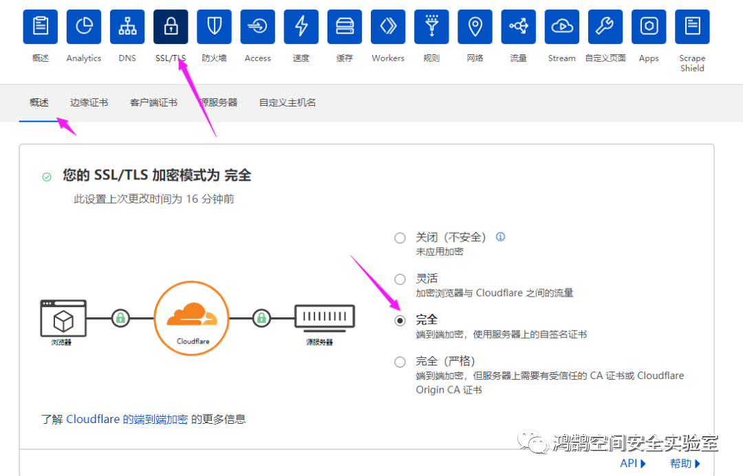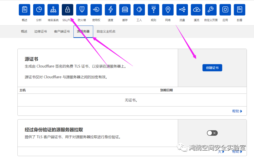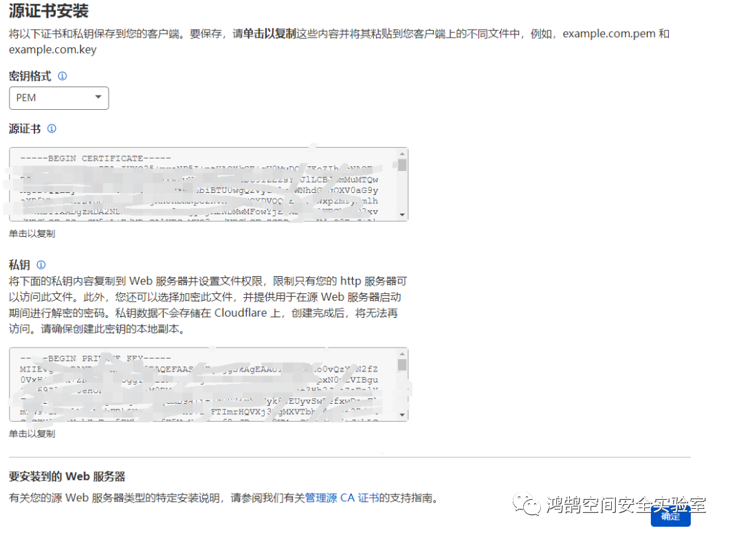 首先配置配置SSL/TLS加密模式为完全,点击 源服务器 -> 创建证书,把密钥和证书复制保存下来,分别保存为pem.pem和key.key,然后上传到cobalt strike服务端