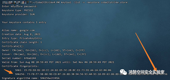 > keytool -importkeystore -srckeystore cobaltstrike.store -destkeystore cobaltstrike.store -deststoretype pkcs12至此证书修改完成,使用命令:keytool -list -v -keystore cobaltstrike.store 可查看证书内容