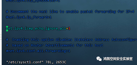 vim /etc/sysctl.conf 打开后按i进入编辑模式,在任意位置新增以下内容net.ipv4.icmp_echo_ignore_all=1