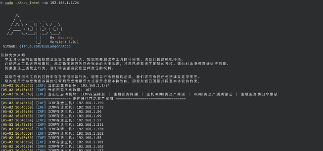 1、扫描内网全部资产 (默认探测:10 A段|172 A段|192 B段)2、指定网段扫描 (支持格式:192.168.1.1|192.168.1.1/24|192.168.1.1/16|192.168.1.1/8|192.168.1.1,192.168.1.2)./Aopo -ip 192.168.1.1/24