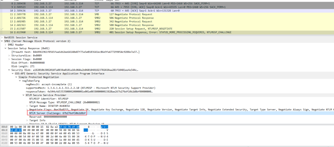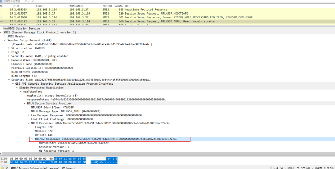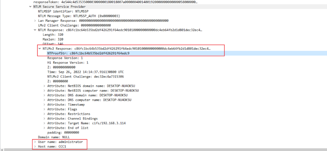紧接着下一个包则是服务端通过NTLM Hash对Challenge加密得到的Response,NTLMv2 Response的值