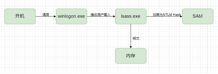 当用户进行开启、注销等需要认证的时候,windows会调用winlogon.exe接受我们输入的密码,然后会将密码交给lsass.exe,lsass.exe进程会先在内存中存储一份明文密码,然后将明文密码进行加密为NTLM Hash后,与SAM文件中的NTLM Hash进行对比,如果一致则通过.