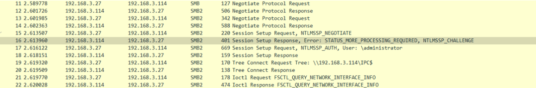 可在目标机器上进行抓包,访问共享是基于SMB协议的,前四个包(Negotiate Protocol Response)则是进行协商