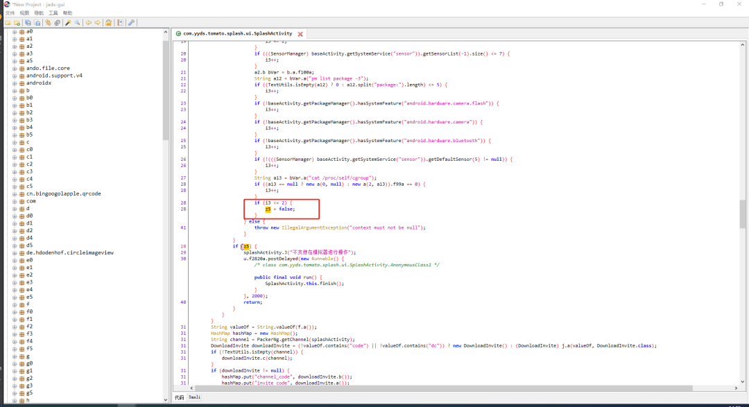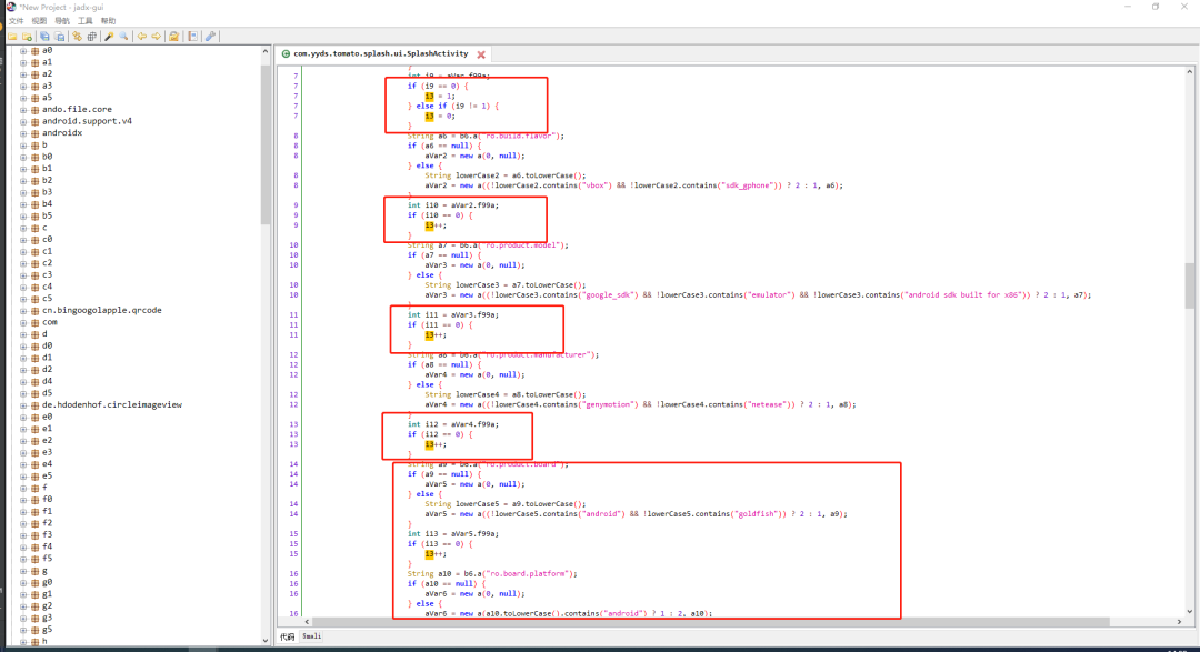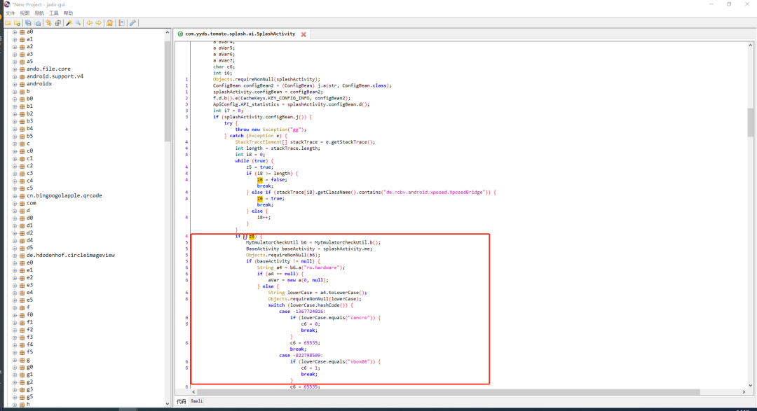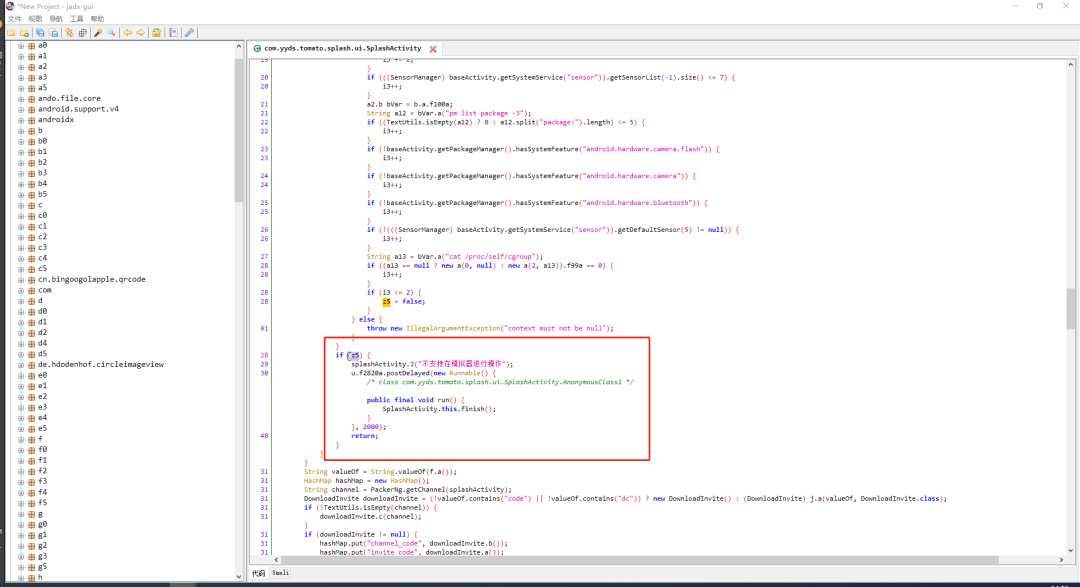 遇到这种情况,说明在这个APP中,代码实现了一种新的模拟器环境检测方法。我们先使用反编译功能,查看下APK源码,进行初步分析。这次这个APP比较方便,没有进行加固,我们可以直接进行反编译。