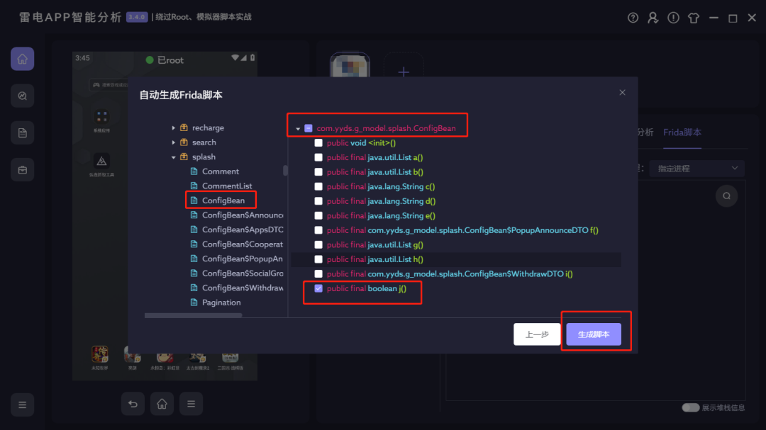 步骤1 通过雷电APP智能分析——Frida脚本功能,我们可以根据类名、方法明选中hook的方法后,一键生成脚本。