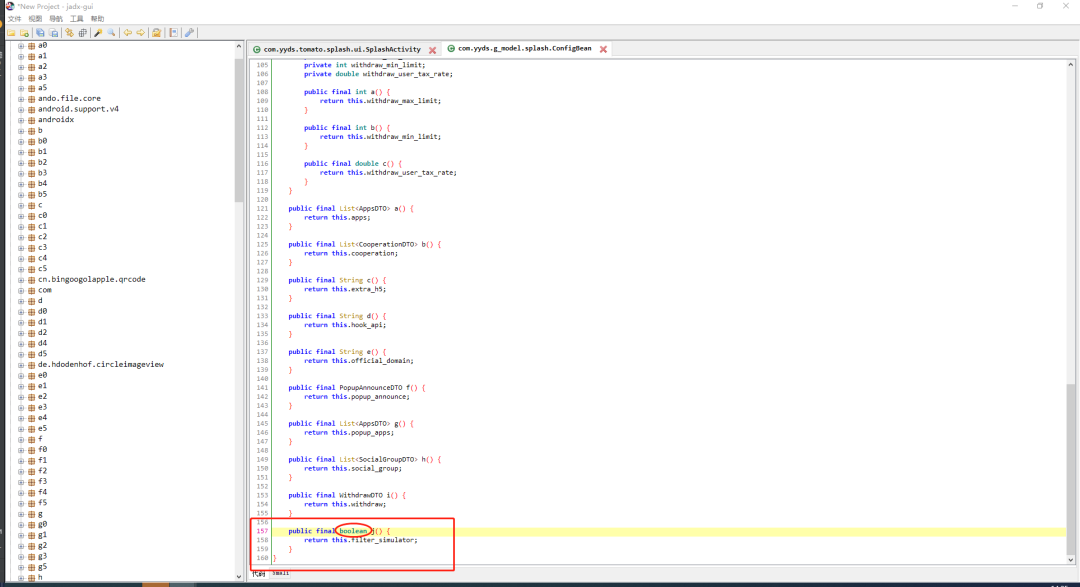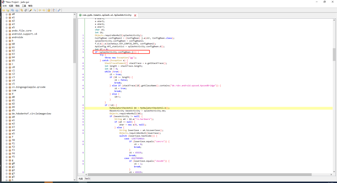 经过上面的一系列分析,我们已经确定了环境检测的代码块,对应的判断条件就是“splashActivity.configBean.j()”这个方法。