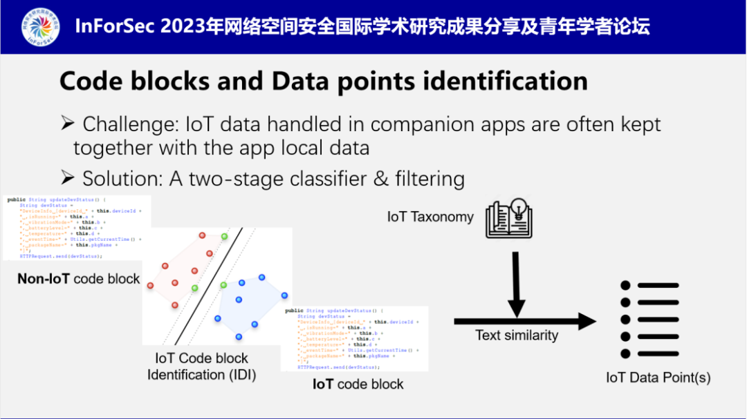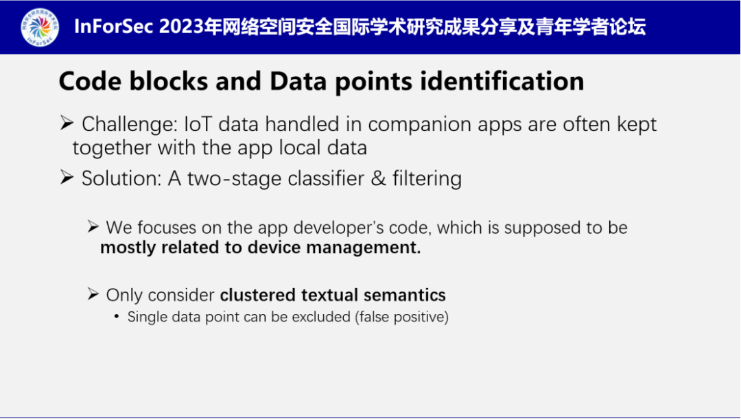 其次,IoT设备数据通常和app中的普通数据混合在一起,难以区分。针对这一难题,南老师提出了一个两级分类器,对数据进行过滤。