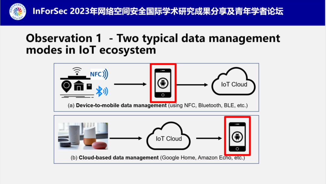 为了实现这一目标,南老师首先介绍了他们对于物联网设备工作机制的分析。第一个关键发现是关于物联网设备的两种主流数据传输模式:第一种,对于一些功能简单的小型设备,联网实际上是通过手机来完成的。连接交互的渠道包括蓝牙、NFC。最终,相关的数据会在手机端进行汇总、语义标注,然后上传到云端(不管需不需要,厂商觉得需要就有可能传);第二种,有些设备是直连云端,或者通过网关来直连云端的。但是同时,相当一部分数据通过云端又同步到手机上,展示给用户,因为手机是用户跟IoT设备的重要交互媒介,也是信息交换的窗口。这两种模式都与手机息息相关,因此,南老师想到从手机端来分析物联网设备相关的信息。