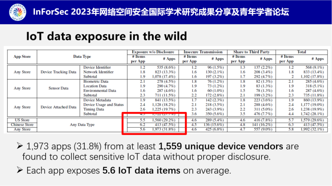 在大规模实验分析中,发现绝大多数app中都检测出了有效的IoT设备数据,并且有超过30%的IoT设备厂商在未经通知的情况下私自收集敏感的IoT设备数据。