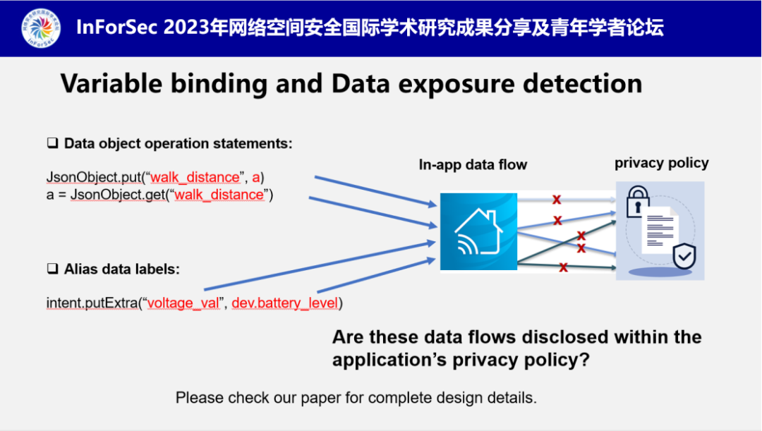 此外,对于分析过程中的变量绑定和数据暴露检测,南老师也进行了简单的介绍,更多的技术细节可以深入阅读论文进行学习。