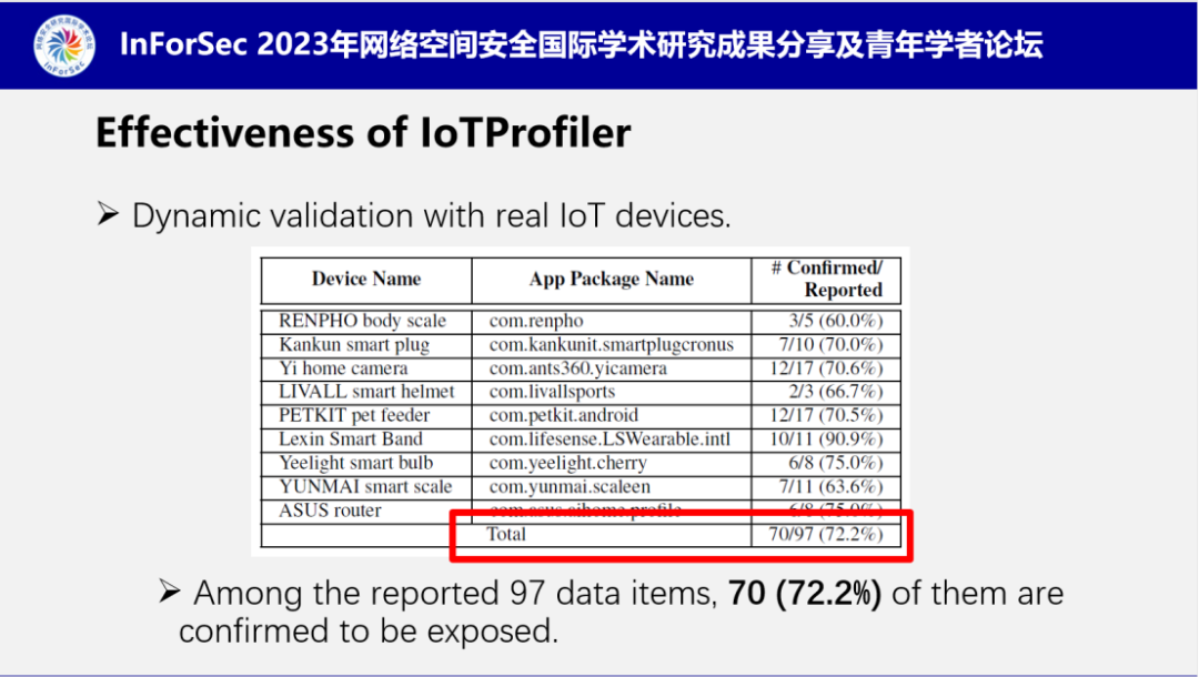 随后,南老师介绍了IoTProfiler的实验结果,证明了该工具的有效性。