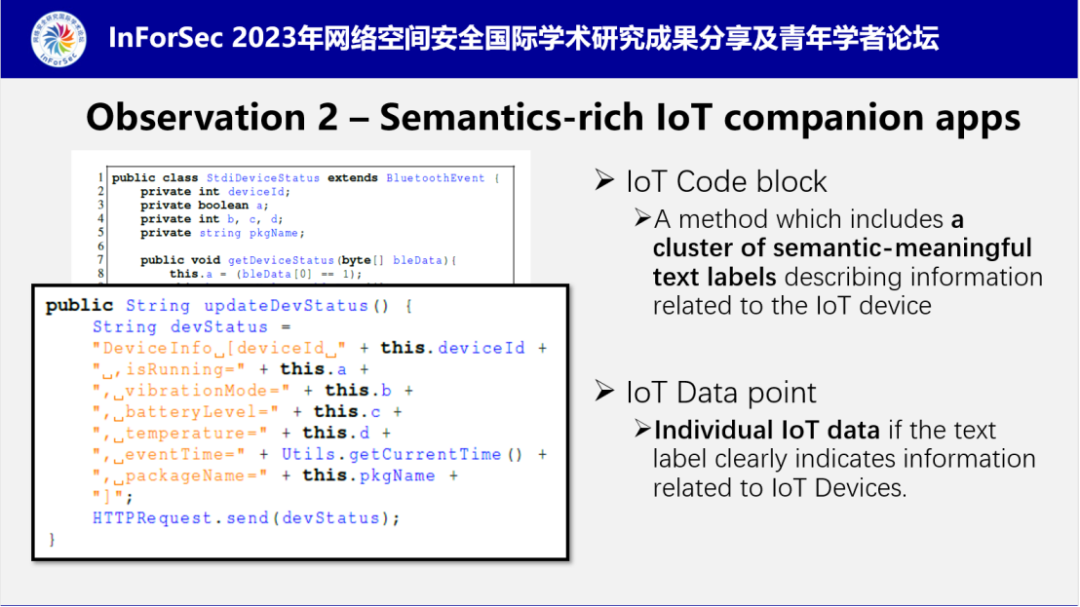 第二个重要观察是App端对IoT数据的处理从代码分析角度来看,具有丰富的语义信息。很多物联网设备固件中看不到的内容,在App代码当中都有对应的描述。例如很多数据具有聚集特征,从软件开发的角度来讲,开发者会把设备相关的信息打包成代码块,方便数据传输、管理。代码块中,特定的IoT数据点会有单独的文本标签用来做标注。