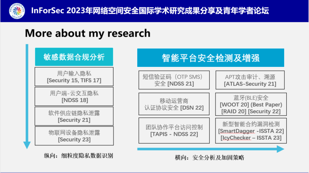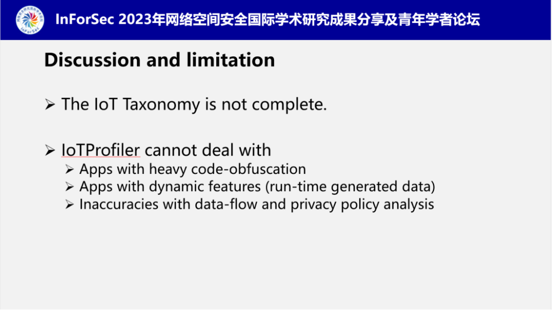 最后,南老师对IoTProfiler的局限性进行了讨论,目前对IoT敏感数据的分类并不是特别完整,此外,对于混淆后的APP以及APP中的动态特性等无法有效地进行处理。