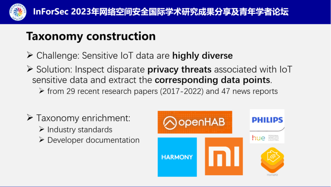 接下来,南老师对IoTProfiler实现过程中的挑战和解决方案进行了展开介绍。首先是对IoT敏感设备的分类,为了解决IoT设备数据高度多样性的挑战,南老师团队通过分析29篇近年来的相关研究论文和47篇报告,人工提取了不同类型的隐私风险和对应的数据点,最终获得包含7个子类型的550个数据项。