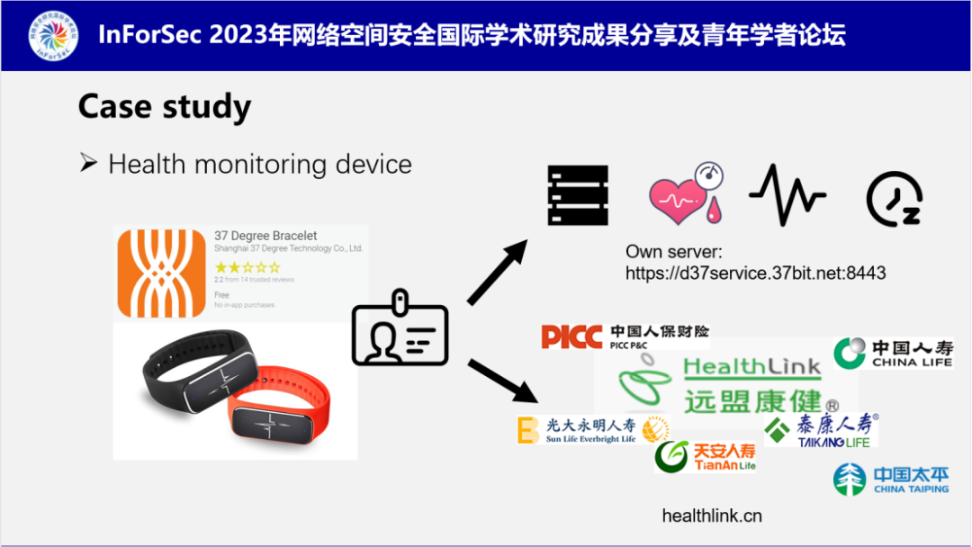 除了这些实验结果的统计分析,南老师还介绍了几个有趣的案例分析,以一个智能手环为例,他们发现这个智能手环在收集了用户的心率,睡眠时间等信息后,除了上传到厂商的服务器外,还拷贝了一份发送给了一个第三方服务器,这个服务器主要是为一些保险公司提供分析数据。