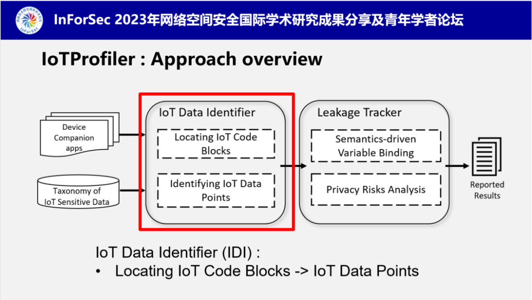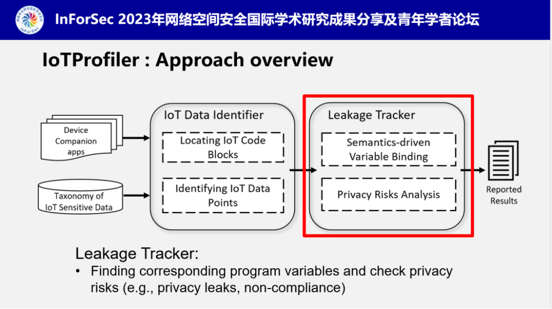基于这两个重要观察,南老师提出了他们设计的分析工具IoTProfiler,其中两个核心模块分别负责定位IoT设备手机应用中的数据标识符和识别潜在的隐私风险。