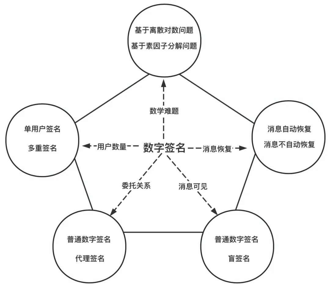 数字签名可以通过不同的维度进行分类,如基于数学难题、签名用户数量、数字签名是否可恢复、签名者对消息是否可见、签名是否支持委托等,具体见下图。