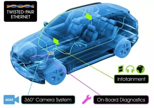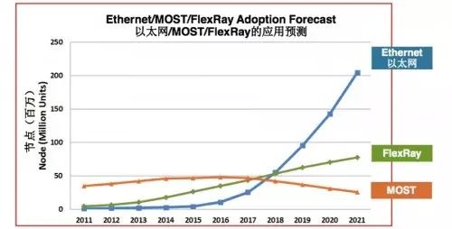 汽车智能化、网联化,甚至自动驾驶大浪已经来临;浪潮带来的是ADAS技术的不断革新、高品质车载娱乐影音的影音推进、以及OTA远程升级、V2X、大数据、云计算等一系列技术的发展;这推进了车载网络容量需求的爆发式发展,显然这已经超出了CAN或FlexRay等传统车载网络的历史使命。这也正是以太网与汽车深度拥抱集成的契机。车载以太网不仅具备了适应ADAS、影音娱乐、汽车网联化等所需要的带宽,而且还具备了支持未来更高性能的潜力(如自动驾驶时代所需要的更大数据传输)。它将成为实现多层面高速通信的基石,相对于20世纪90年代的控制器局域网(CAN)革命,它的规模将更大,意义将更深远。专家预测,到2020年,汽车中部署的以太网端口将达5亿个。↑ Etherent,FlexRay,MOST节点装载数量预测当前主流的车载网络主要由 CAN、LIN、FlexRay、MOST 、LVDS等构成。除了LVDS这些网络标准基本上都是面向汽车行业制定,有着浓重的汽车行业特色。表1中对各种不同网络形式对了简要的对比。CAN主要用于车上控制数据传输,是现役车载网络应用最为广泛的标准,最大传输速度为 1 Mb/s,可以说兴起于20世纪90年代的控制器局域网(CAN)革命,对于整个汽车电子行业发展的推动是巨大的。LIN 是一种低成本通用串行总线,在汽车领域主要用于车门、天窗、座椅控制等,最大传输速度为 20 kb/s。FlexRay 是继 CAN 和 LIN 之后的新一代汽车控制总线技术,同样属于共享式总线技术,带宽可达 10Mbps。FlexRay 的主要优势在于相比CAN 总线具有较高的带宽,可以满足汽车关键应用的要求,但是同样作为共享式总线技术,其成本却很高,主要适用于中高端车中的线控系统(如悬架控制、变速箱控制、制动器控制、转向控制等)。MOST主要支持的多媒体流数据传输,MOST150标准的最大带宽为150 Mb/s的,在车载多媒体数据传输应用较多,MOST150支持基于IP的应用程序,由于单一供应商的问题,基础开发成本较高。LVDS是一种电气数字信号系统,通过铜缆双绞线传输高速数据(最高可达 850 Mb/s,最长传输距离10 m),是计算机总线的一部分。在汽车领域 LVDS 主要用于屏幕和摄像头之间的数据传输。如果说2013年宝马在X5仅仅是拉开了以太网进军车载系统的帷幕(图例),那么可以毫不夸张的说时至今日以太网与汽车将迎来了一次深度拥抱的契机,它们也将共同演绎一场“融合”大戏。大家耳熟能详的摩尔定律告诉我们微处理器上的晶体管数目每两年就会增加一倍;这一定律似乎同样适合汽车行业,随着处理器运算能力和硬件的高速发展,使得许多创新在汽车环境下得到迅速推进,汽车电子产品在整车中所占比重也与日俱增,连接ECU的网络带宽需求也相应的增大,这一需求将远远超出CAN或FlexRay等传统车载网络的容量极限。此外,伴随着车辆网联化、智能的推进,智能手机与车载设备的联动、云和大数据的运用,以及高级驾驶辅助系统(ADAS)的普及,构筑新电子网络总线平台已经成为新一代汽车的必然任务,一直被汽车行业拒之门外的以太网不会放过这次绝佳的契机。新的汽车功能,如自动泊车系统、车道偏离检测系统、盲点检测和高级信息娱乐系统等引发了对新的数据总线需求。显然未来我们需要的是更加开放、高速,且易于与其他电子系统或者设备集成的车载网络,同时有助于减少功耗,线束重量和部署成本。对于上述需求以太网似乎能提供一揽子的解决方案,以博通公司采用的突破性 BroadR-Reach 技术为例,其可用单对的非屏蔽双绞线进行信号传输,并能够提供 100Mbit/s 及更高的宽带性能,并使电缆重量减轻 30%、降低连接成本可达80%。↑ 2015年CES发布的下一代BroadR-Reach 车载以太网芯片传统车载网络支持的通信协议较为单一,而车载以太网可以同时支持AVB、TCP/IP、DOIP、SONIP等多种协议或应用形式。其中,Ethernet AVB 是对传统以太网功能的扩展,通过增加精确时钟同步、带宽预留等协议增强传统以太网音视频传输的实时性,是极具发展潜力的网络音视频实时传输技术。SOME/IP(Scalable Service-Oriented MiddlewarE on IP)则规定了车载摄像头应用的视频通信接口要求,可应用于车载摄像头领域,并通过API实现驾驶辅助摄像头的模式控制。作为AVB协议的扩展,车载时间敏感网络(TSN,Time-Sensitive Networking)则引入时间触发式以太网的相关技术,能高效的实现汽车控制类信息的传输。此外,1Gbit 速率通信标准的车载以太网同时还支持 POE(Power Over Ethernet)功能和高效节能以太网(EEE,Energy-Efficient Ethernet)功能,POE 功能可在双绞线传输数据的同时为连接的终端设备供电,省去了终端外接电源线,降低了供电的复杂度。历史经验告诉我们,以太网之所以长期以来如此成功,主要原因之一便是以太网是一种可持续更新、发展的技术。在经历了标准以太网(10Mbps)、快速以太网(100Mbps)和千兆以太网(Gigabit Ethernet)推进和发展后,以太网还在继续着不断的自我迭代升级。当然在支持带宽持续增长的同时,它任然保持对原有系统的兼容性。所以说:一旦以太网技术推广至汽车行业,它带来的不仅仅是一种成熟的通信技术,更是一种对未来的适应能力。多年来,最能体现以太网是如何适应新需求的、发掘新潜力的事例之一就是当前非常流行的无线网络wifi的引入。类似于Broadcom公司的BroadR-Reach,WiFi也有专供汽车使用的变体,“汽车环境无线存取”WAVE;2010年发布的IEEE802.11p通信规范对WAVE进行了定义,后被