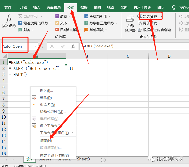 浅隐藏:可以通过检查单元格是否有缺来判断,取消隐藏可以看到恶意宏代码
