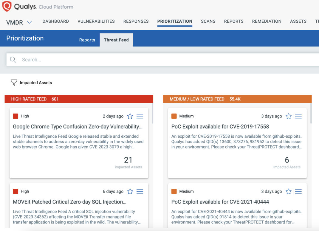 VMDR also enables you to stay on top of these threats proactively via the ‘live feed’ provided for threat prioritization. With ‘live feed’ updated for all emerging high and medium risks, you can clearly see the impacted hosts against threats. With this risk-based prioritization, you can quickly identify assets that are impacted by critical vulnerabilities like these and others as soon as they are announced.