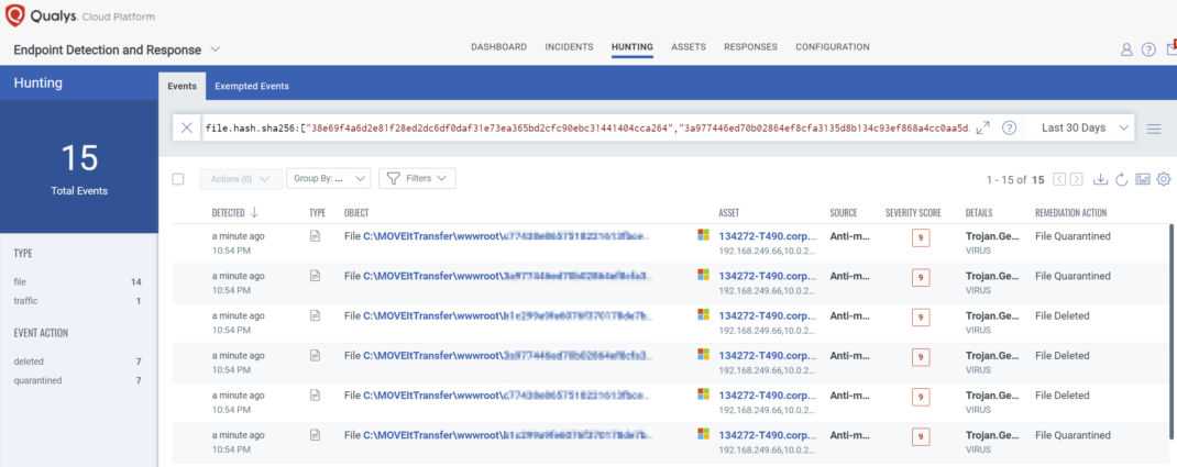The post-exploitation activities have been documented and can be hunted for in environments which suspect they may have been compromised. Using a product such as Qualys Endpoint Detection and Response (EDR), users can search for the file hashes and file names outlined in the IOC document provided by the MOVEit Security Advisory. For example, a QQL below can find all of the hashes associated with the LEMURLOOT webshell: