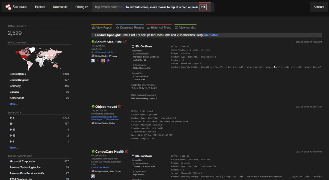 From Shodan, you can search for the MOVEit Favicon Hash and see that at the time of this writing, there are more than 2,500 instances MOVEit exposed directly to the internet.