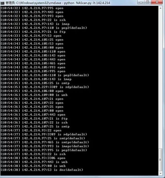python NAScan.py -h 10.111.1python NAScan.py -h 192.168.1.1-192.168.2.111python NAScan.py -h 10.111.1.22 -p 80,7001,8080 -m 200 -t 6python NAScan.py -h ip.ini -p port.ini -n