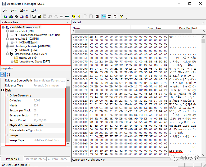 1 从图片左下角基本信息可以看出该镜像是一个无损坏的vmware虚拟磁盘。该镜像原始磁盘总大小为:73400320*512=37580963840bytes=35GiB。2 从图片右侧十六进制可以看出,MBR分区表中只有一个分区表项,分区类型为0xEE且紧接着MBR项的为`EFI PART`头部标志。初步判断:该镜像是GPT分区表类型,且分区表完整。不属于单分区镜像。因为`EFI PART`是紧接着MBR分区表项的,所以扇区大小是512字节,不是4096字节。3 从图片左上角可以看到:有1G的分区,文件系统为ext4(猜测是/boot分区)和包含lvm2,lvm2种包含了20G的lv分区,文件系统是ext4文件系统(猜测是根分区)。![]()
