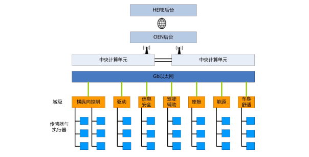奥迪将采取中央集群计算方案(Central Computing Cluster )。如下图所示,整车划分为:驱动域、能源域、横纵向控制域、驾驶辅助域、座舱域、车身舒适域、信息安全域;不同的域之间通过高速以太网来进行信息交互,域内采用CAN\LIN 等进行实时低速通信;新架构分为传感器与执行器层和承载不同功能的域层;车辆的中央计算单元会与企业的后台相连接,奥迪的后台会与HERE 后台相连,接进行数据共享。